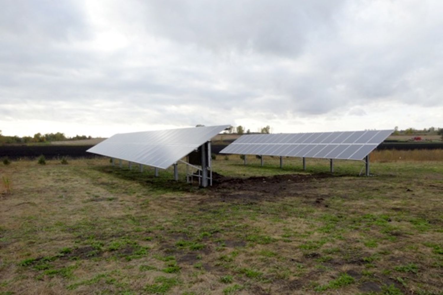A two row solar array tucked out of the way on a crop farm just down the road.